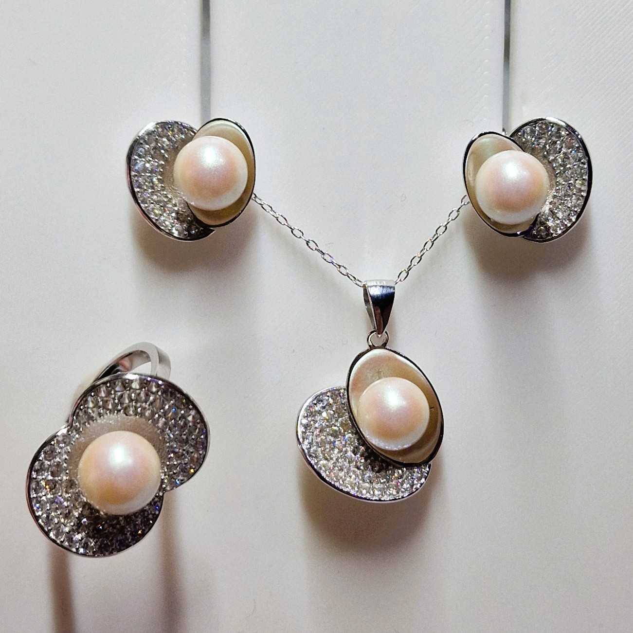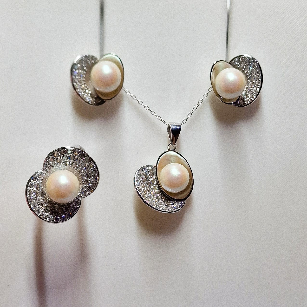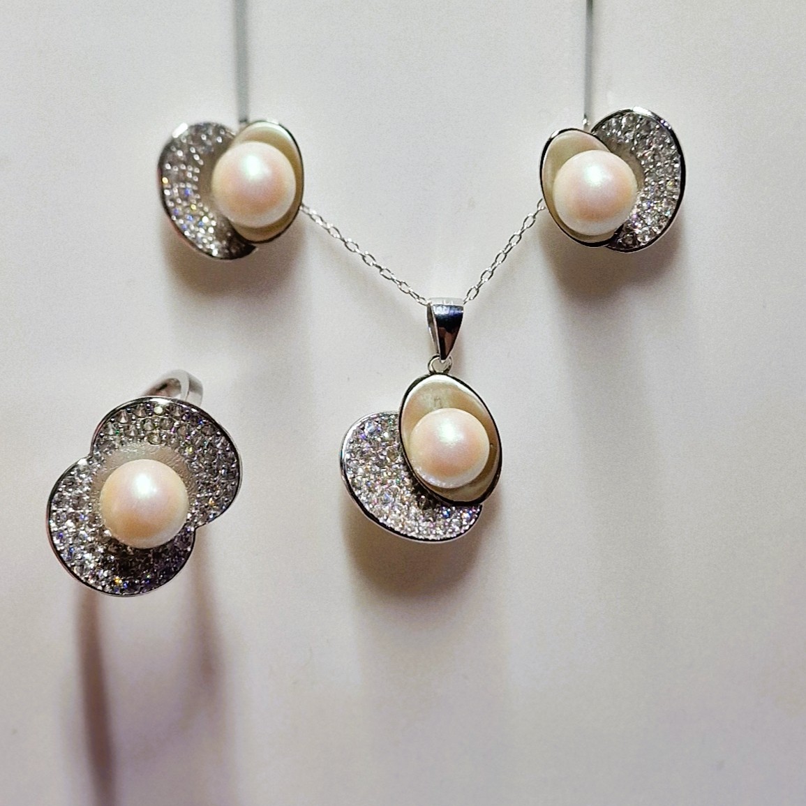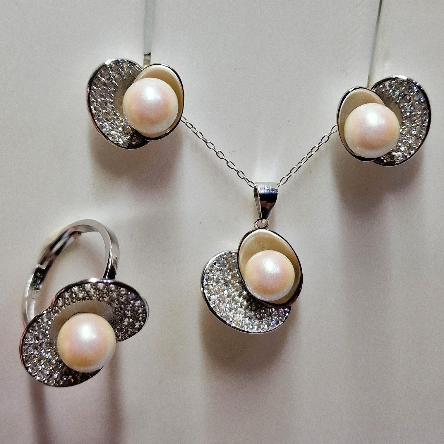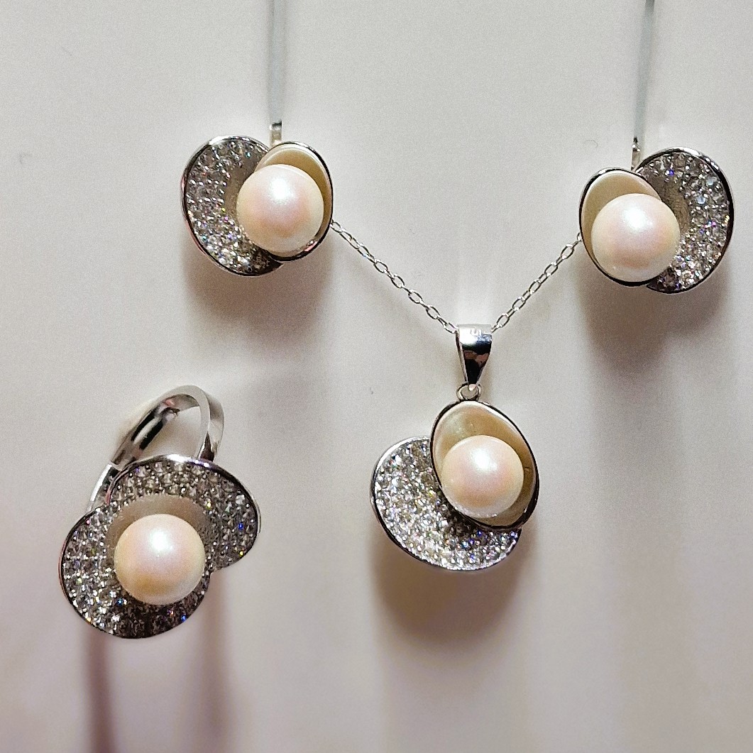 This stunning matching set, crafted from high-quality 925 sterling silver, includes a pendant, a pair of stud-back earrings, and a ring. This set features four openings designed to hold your unique pearls, making this set a perfect canvas for personalisation.