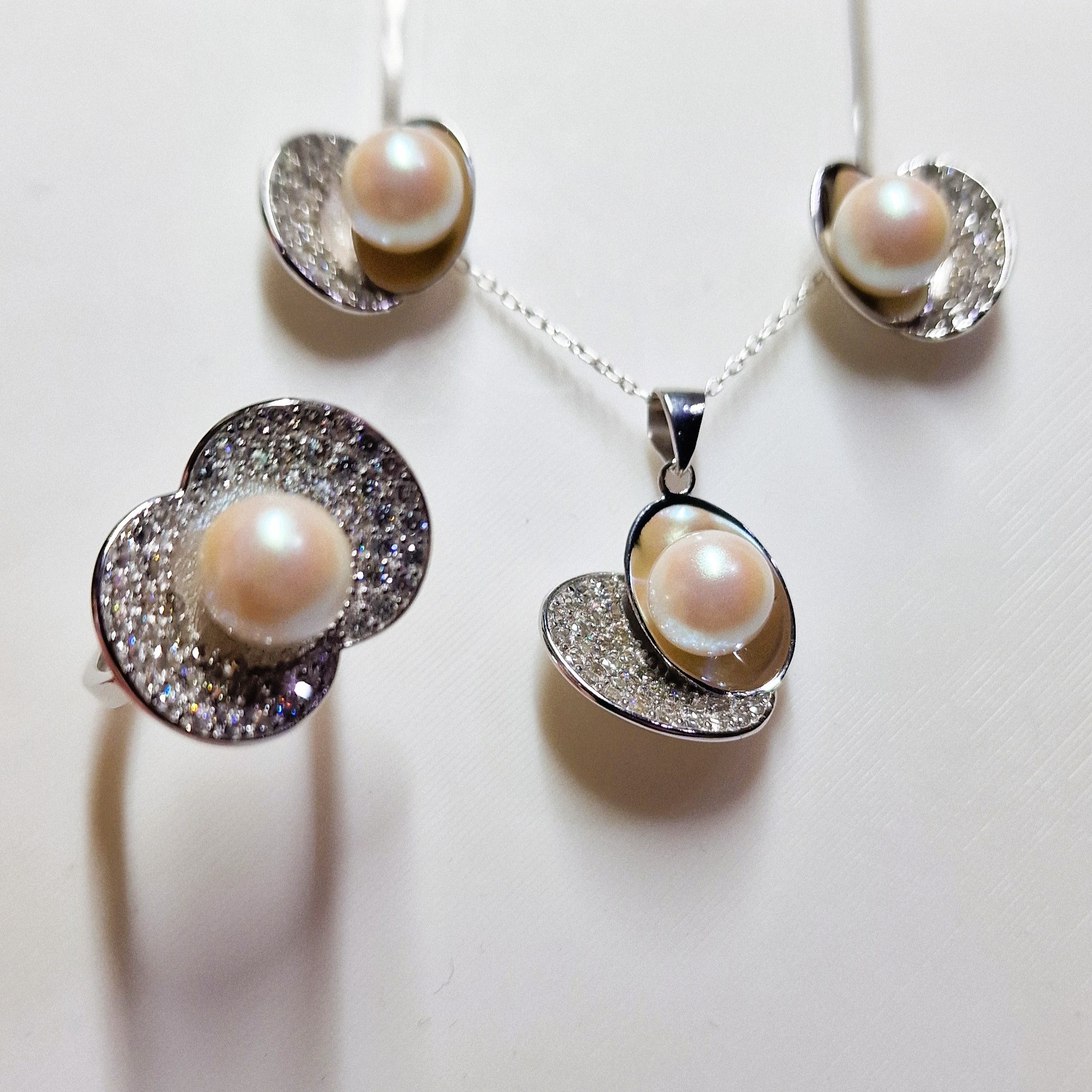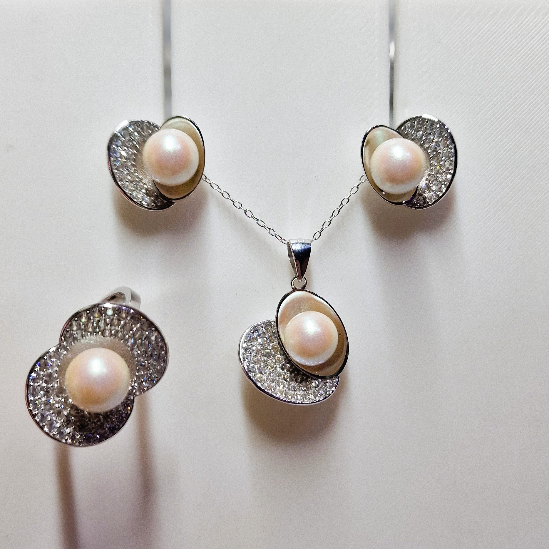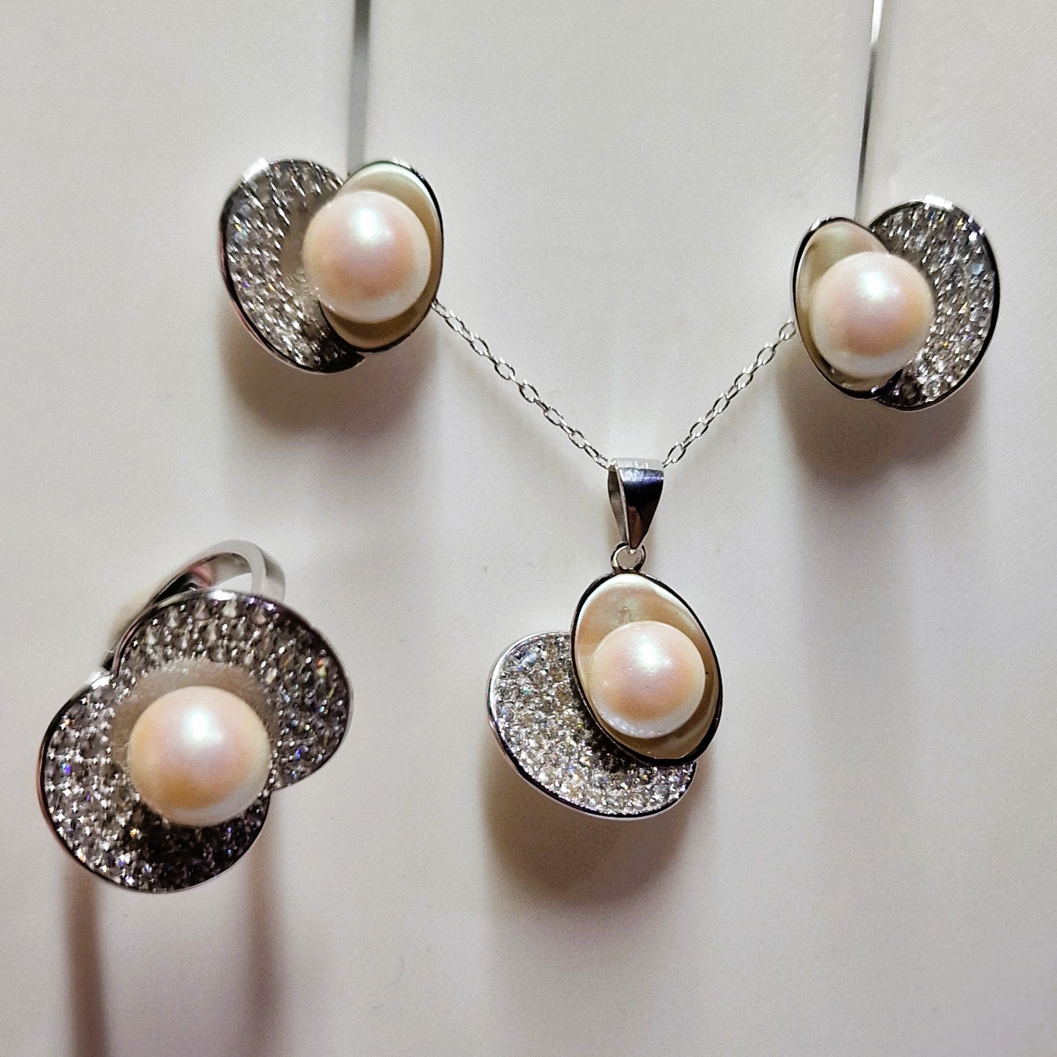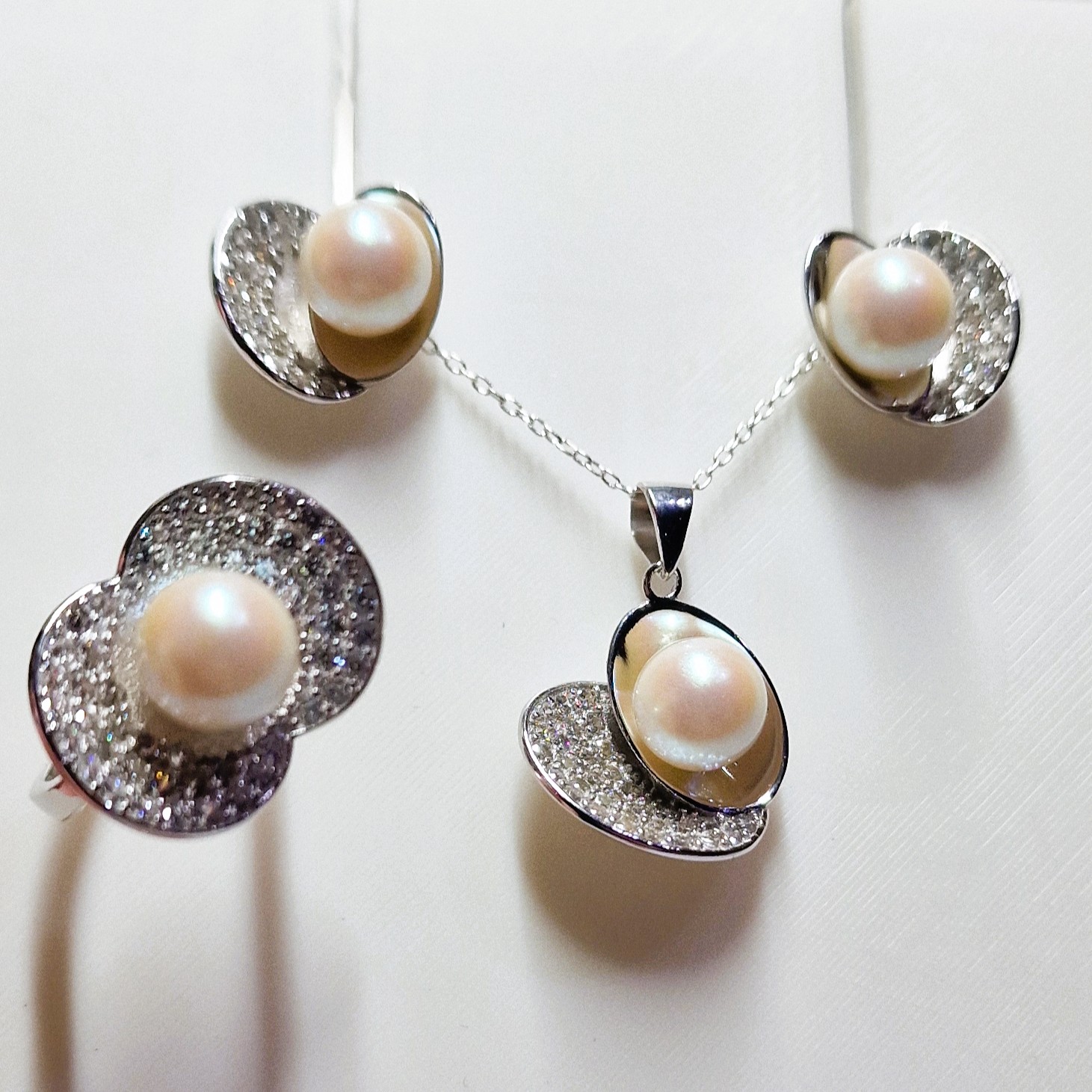 This stunning matching set, crafted from high-quality 925 sterling silver, includes a pendant, a pair of stud-back earrings, and a ring. This set features four openings designed to hold your unique pearls, making this set a perfect canvas for personalisation.