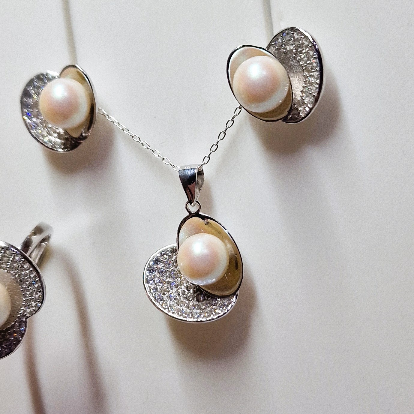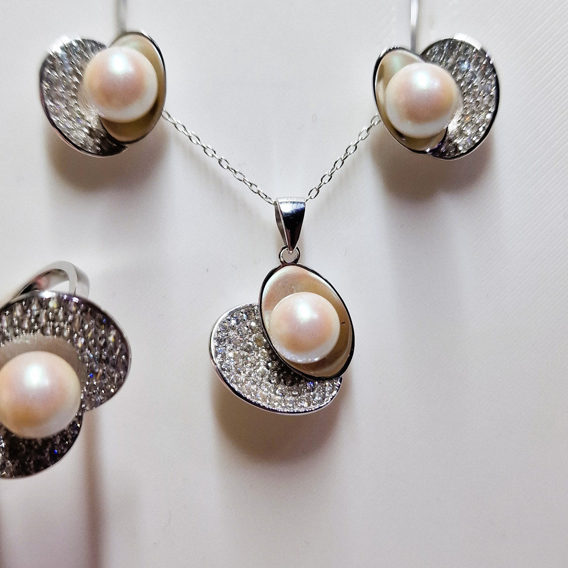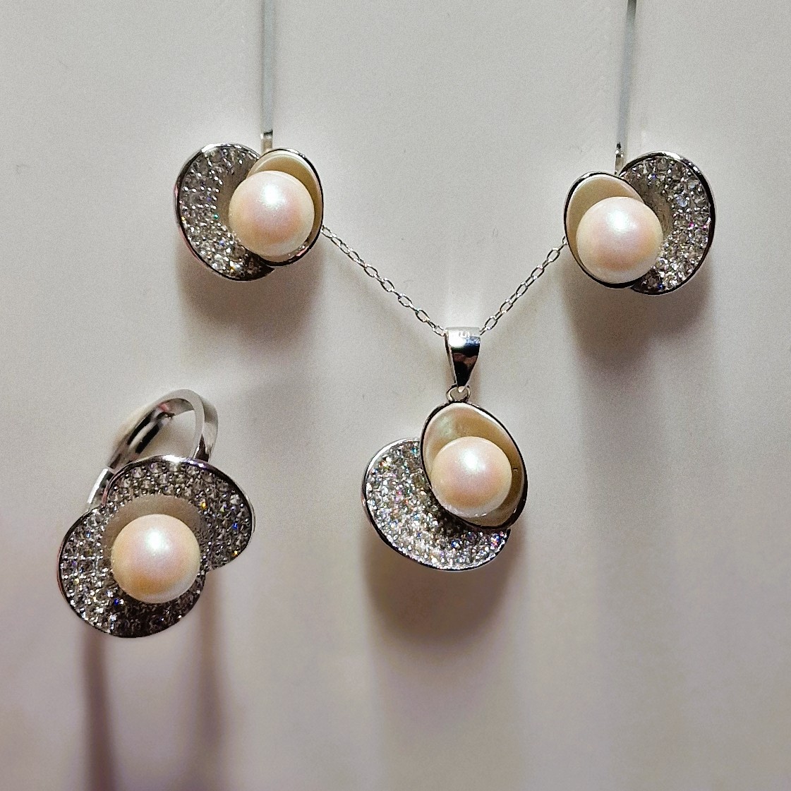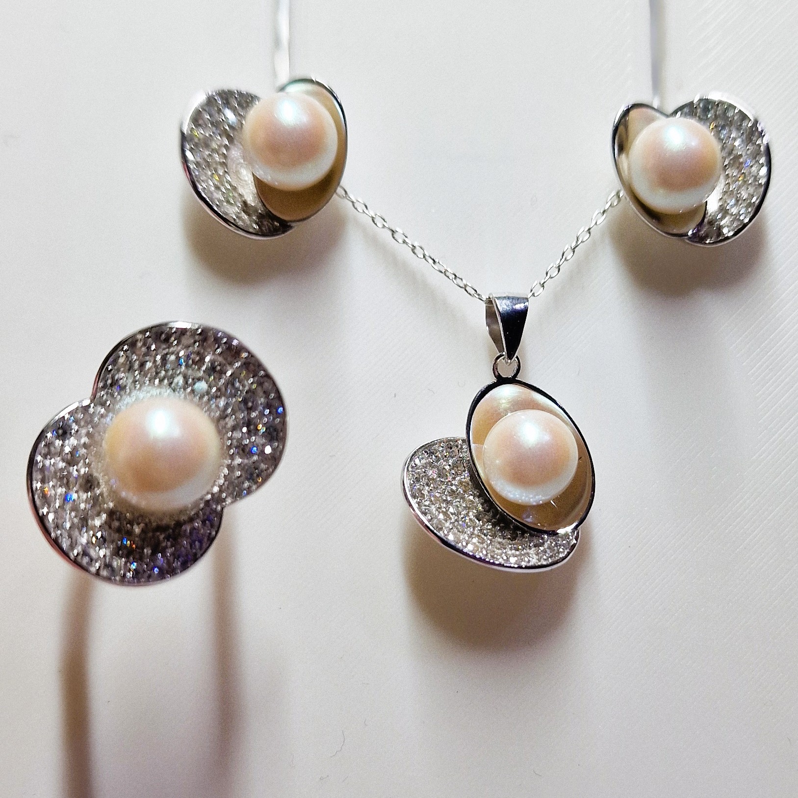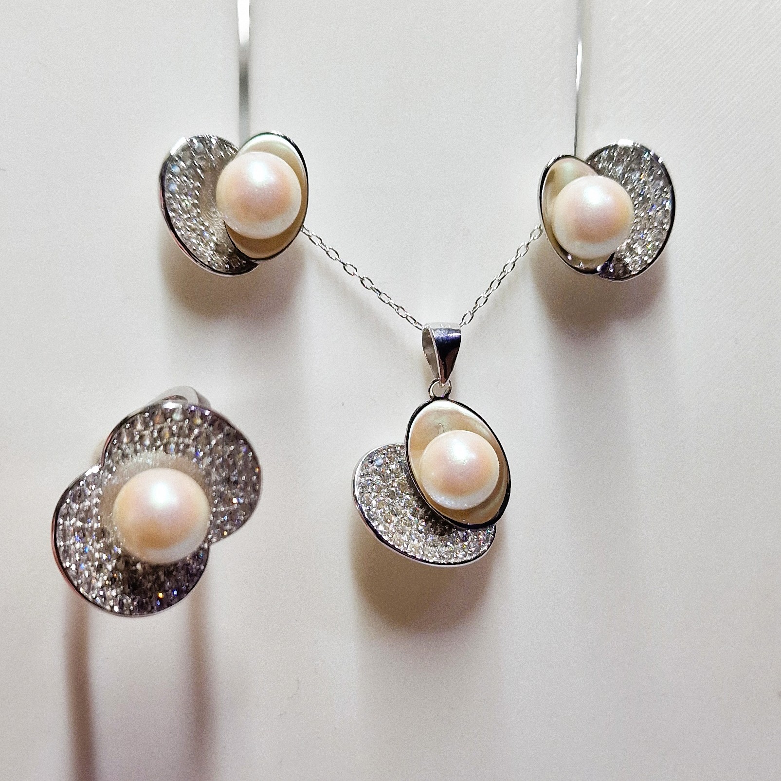 This stunning matching set, crafted from high-quality 925 sterling silver, includes a pendant, a pair of stud-back earrings, and a ring. This set features four openings designed to hold your unique pearls, making this set a perfect canvas for personalisation.